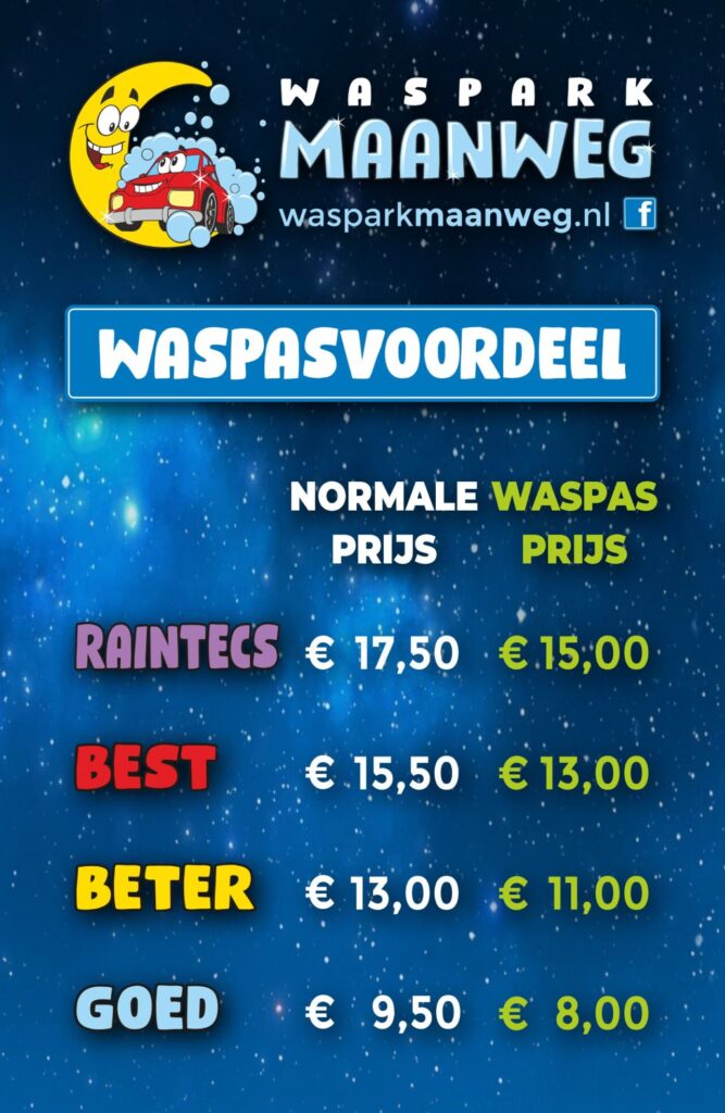 Met onze waspas heeft u altijd voordeel tijdens het wassen! Daarbij ontvangt u ook nog eens altijd een bonus bij het opwaarderen vanaf €100,- op uw tegoed! Bekijk de afbeeldingen hiernaast voor de prijzen en kortingen op onze wasprogramma’s!